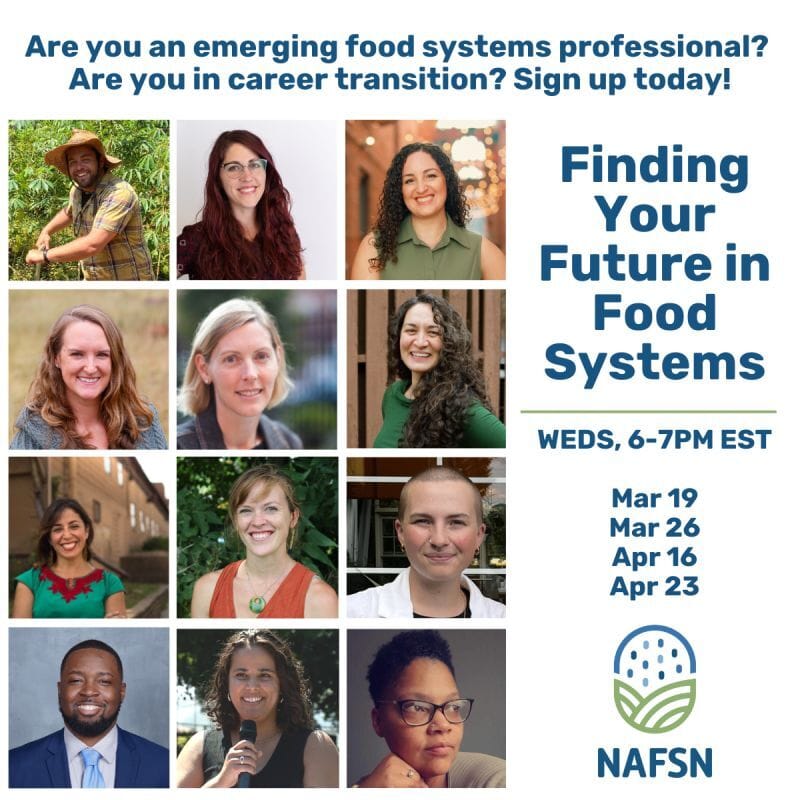 North American Food Systems Network (NAFSN) is hosting a webinar series in March and April on Finding Your Future in Food Systems. There will be four webinars in this series, which are free and open to the public.