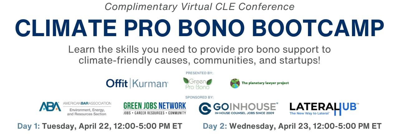 Green Jobs Network is a sponsor of this event, which is presented by the Planetary Lawyer Project, Offit Kurman, P.A., and Green Pro Bono.