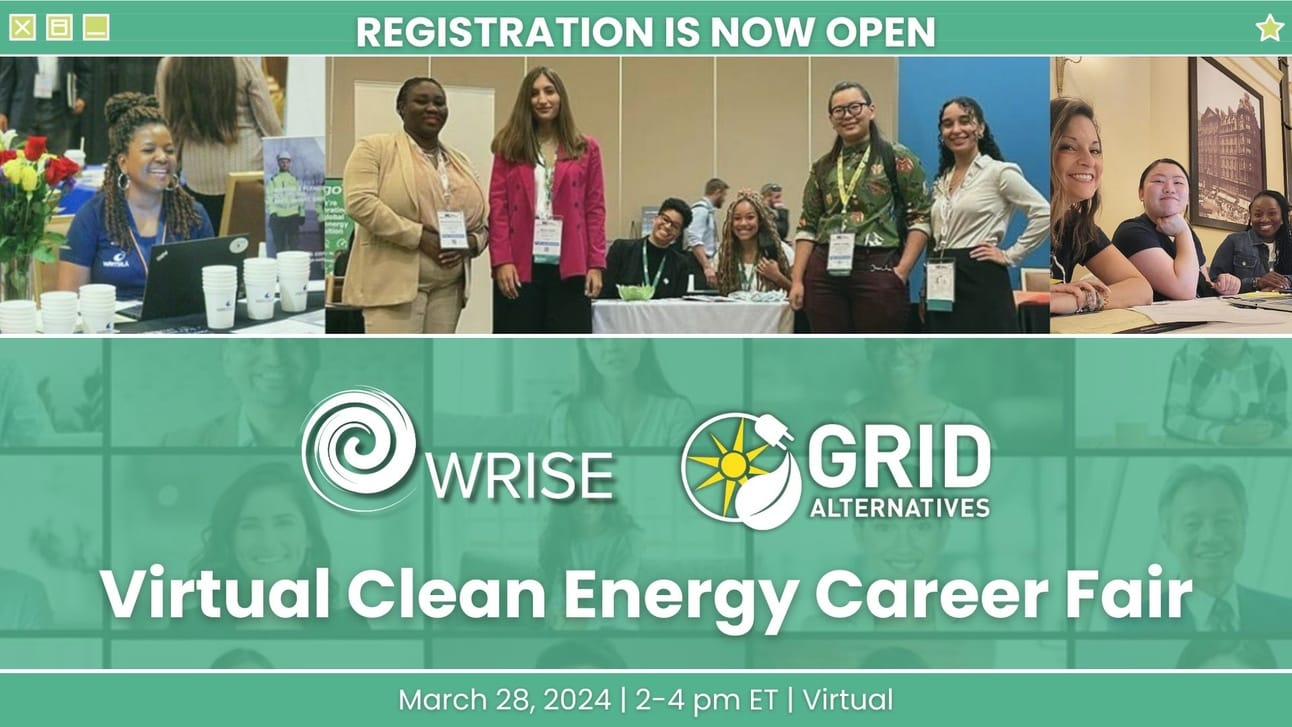 Last Call! Women of Renewable Industries and Sustainable Energy (WRISE), in partnership with GRID Alternatives, will be hosting a FREE Virtual Clean Energy Career Fair on March 28, 2024. The two organizations collaborated on a career fair in 2023.