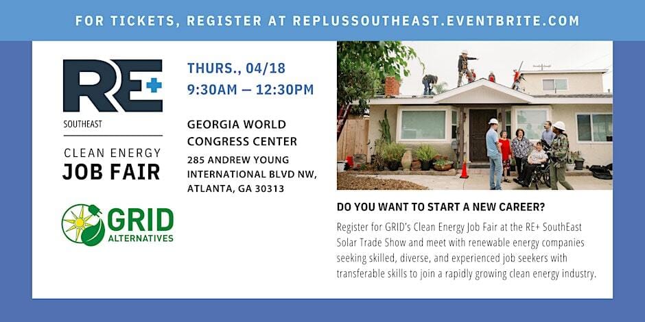 Free attendee registration is now available for the Southeast RE+ Clean Energy Job Fair. This event is being organized by GRID Alternatives and Elevate and will be in Atlanta on April 18 at the Georgia World Congress Center.