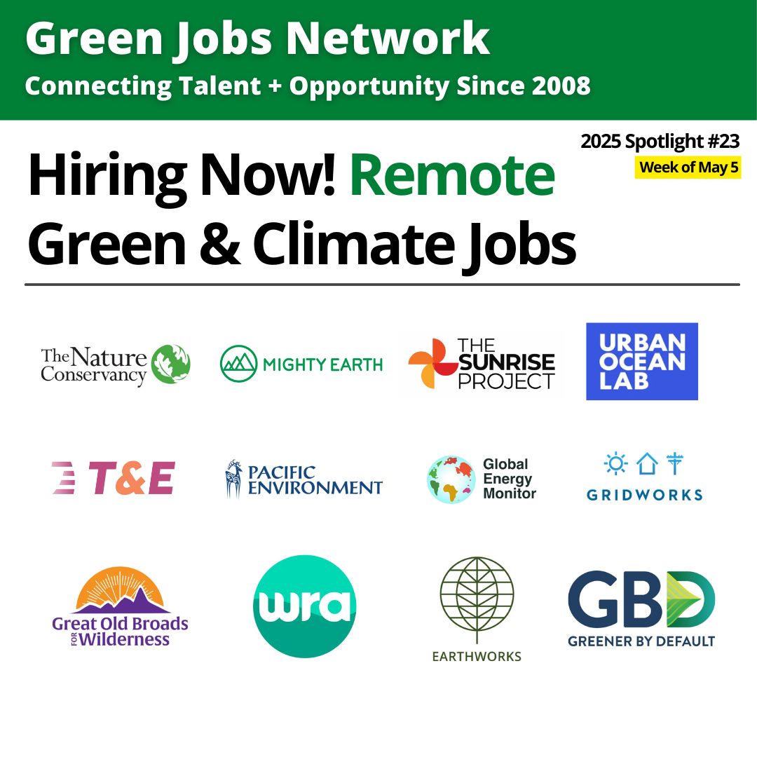This newsletter contains a sampling of the many jobs that you can find via Green Jobs Network. For more, visit our green jobs board, job board for climate action, social impact jobs board, and website for remote jobs.