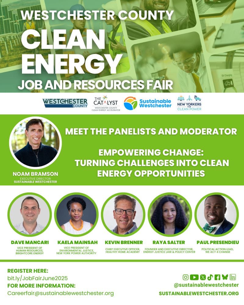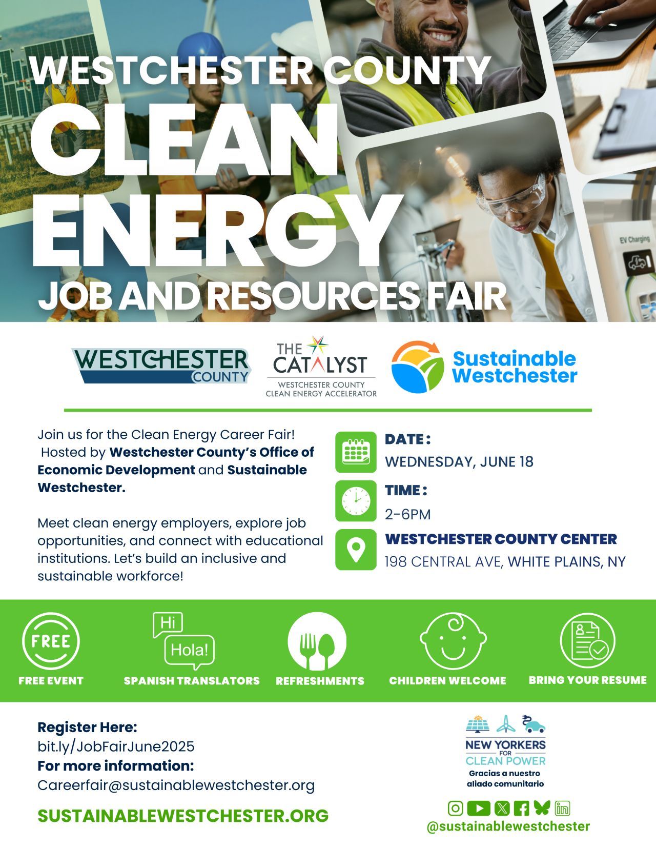 The Westchester County Clean Energy Jobs and Resources Fair will be on June 18 from 2 - 6 pm at the Westchester County Center (198 Central Avenue) in White Plains, NY.