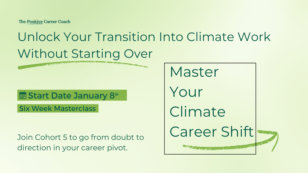 Green Jobs Network is excited to share a discount on the upcoming program Master Your Climate Career Shift. This is a six-week cohort-based online program that is intended to empower mid-career professionals who are interested in moving into climate work.